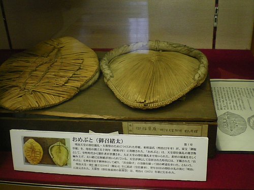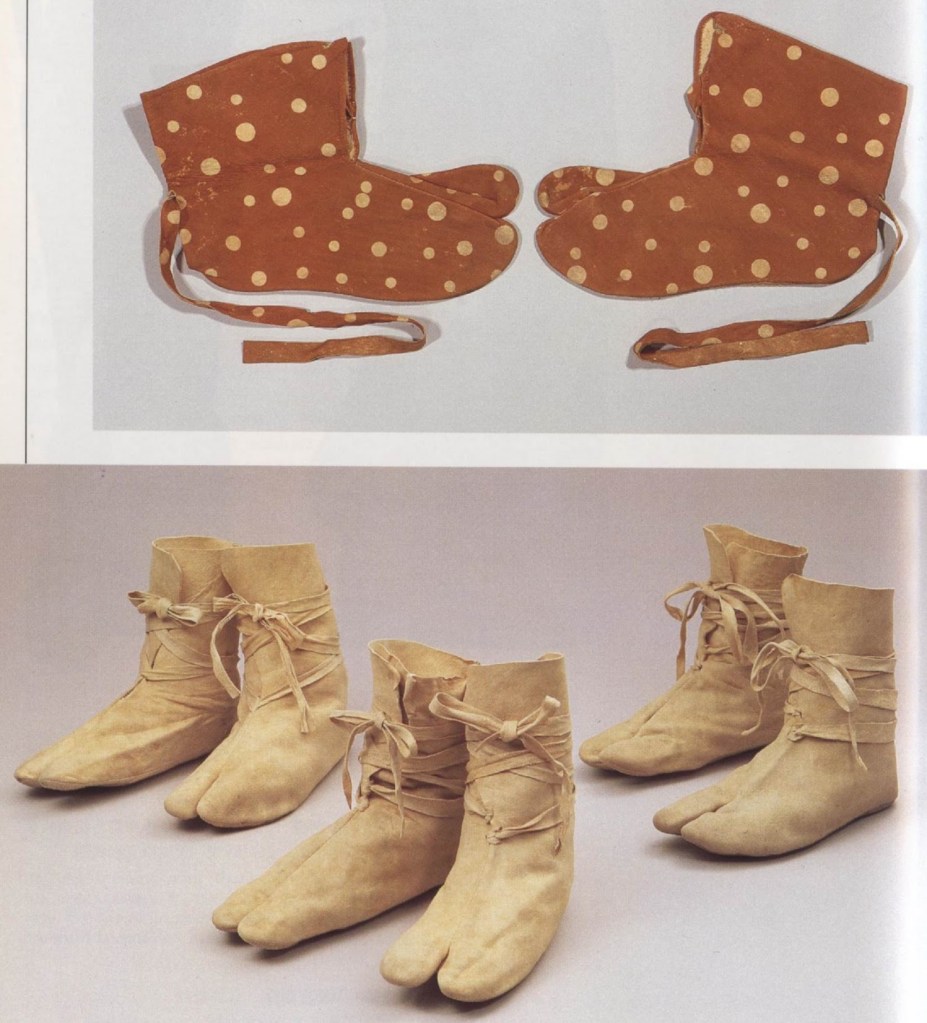 The white tabi here are from the Momoyama period, and the spotted are from early Edo. The construction is similar to modern tabi except that the opening is at the front of the ankle rather than the back, and they’re closed with ties which could be attached in various locations. Tabi colors seen in Momoyama ensembles include a wide variety of colors such as white, sky blue, golden yellow, and purple, and the material could be fabric or leather.