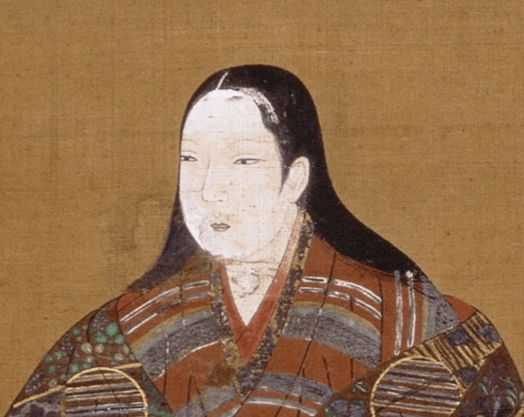 Women’s portraits of this period normally show hikimayu (引眉), where the eyebrows have been shaved or plucked off and replaced with soot smudges higher on the forehead. The models in the Jidai Matsuri do not, presumably because the women modeling the ensembles were not enthusiastic about the idea of removing their eyebrows. In this portrait traditionally held to be of Yodo-dono, her hikimayu are drawn fashionably high, close to to her hairline, and the makeup other than oshiroi is subtle.