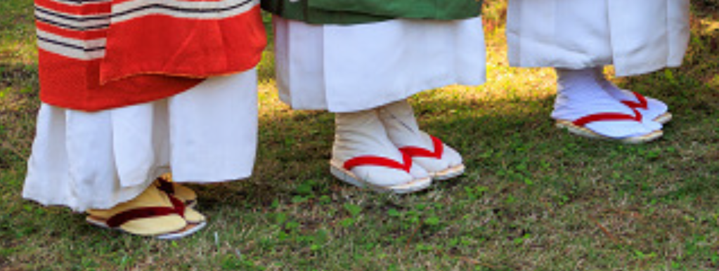 Zōri (sandals) are typically worn with these ensembles. The hanao (straps) were often red or white. These can be woven from rice straw (warazōri) or bamboo sheathing/take no kawa (takezōri). The latter are sold as “bamboo leaf” dumpling wrappers in Asian grocery stores if you want to experiment.
