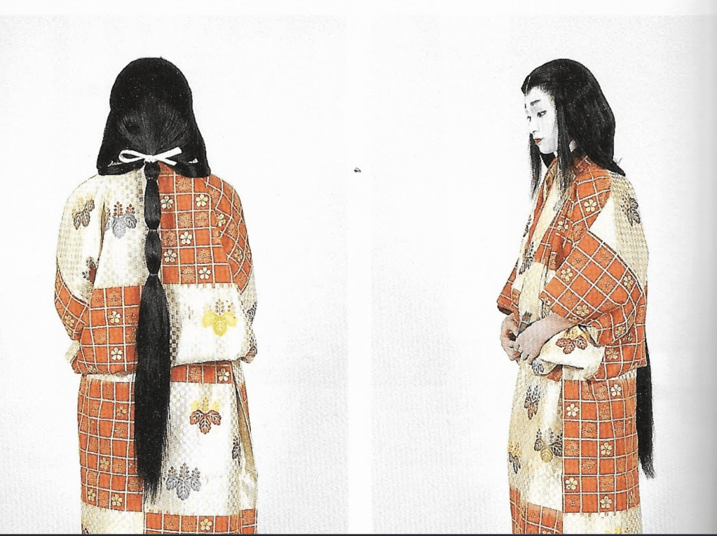 The join between one’s own hair and an extension can be covered using a brocade wrap called an onaga (尾長) secured by kumihimo cord or a similar cover made of hōshogami.