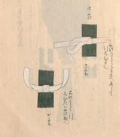 You may want to look up YouTube videos on Japanese hair styling, nihongami (日本髪) for information on tying these. While it’s extremely unlikely that any of the hairstyles you see date from before 1600, they almost all demonstrate how to tie motoyui, and some show hira-motoyui as well. There are several ways to make a hira-motoyui, but the simplest is to start with a ¾ to 1” strip of heavy paper or posterboard (hōshogami is 0.18mm thick) and fold as shown in the diagram below (read right to left!)