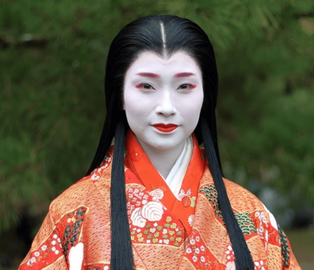 The teeth are traditionally blackened with ohaguro (a mix of tannins, iron, and vinegar), as a final touch to this distinctive ideal of beauty.