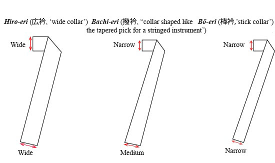 | Collar (eri) | Collar is usually knee-length (even for knee-length garments) and full width (hiro-eri, 5-6″ folded in half for wear), no collar protector (kake-eri) | Collar is hip length when belted, hiro-eri for women’s kimono, bachi-eri for women’s yukata, bō-eri for men and children |