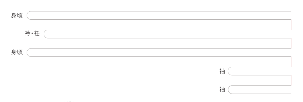 This diagram shows a width of narrow fabric folded back and forth to form a kimono or katabira, ready to cut along the red lines on the right (the curved left edges of the body panels and sleeves are the shoulder fold). Seams require minimal finishing because most are selvages.
