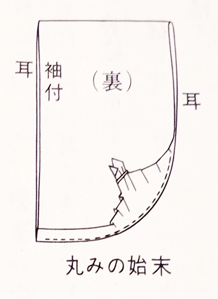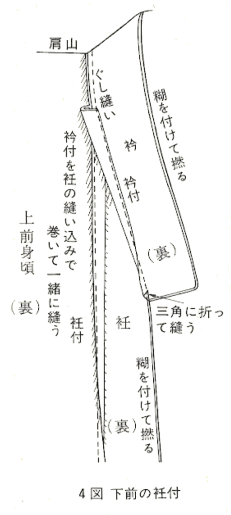 Because garments were frequently resewn, repurposed, in need of mending, etc, cutting of the fabric was kept to an absolute minimum. Once the rectangles are cut and the neck slit made, no further cutting needs to be done. The corners of the body and overlap panels covered by the collar (shown at left) and the corners of curved sleeves are basted in place for later use. When turning something inside out, corners are handled in ways that do not involve clipping. Images from Shiryō Nihon Ifuku Saihōshi.