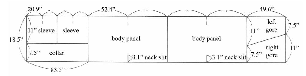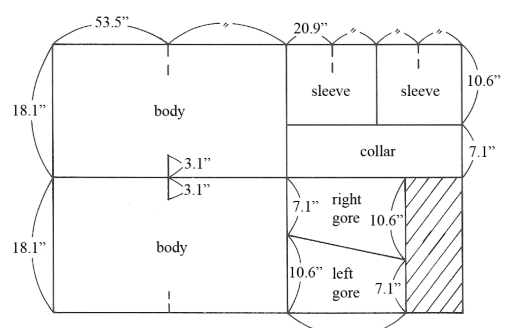 Most garments are made from rectangles, with an occasional straight diagonal line. Designs are based on narrow fabric widths (often ~14″ for hemp/ramie, ~17″ for silk). Shaping is done through belting, tucks, and adjusting the width of seam allowances.