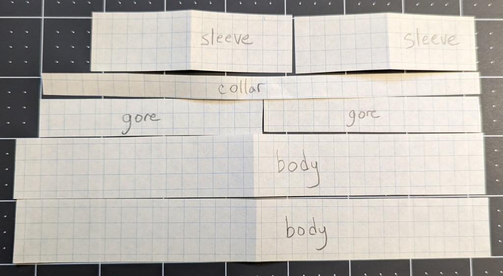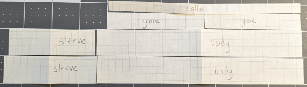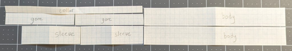 - 1/2″ in from the ends of the neck slit and 1/2″ down from the top of the gore (okumi), marking this dot on the gores as well as the body panels
