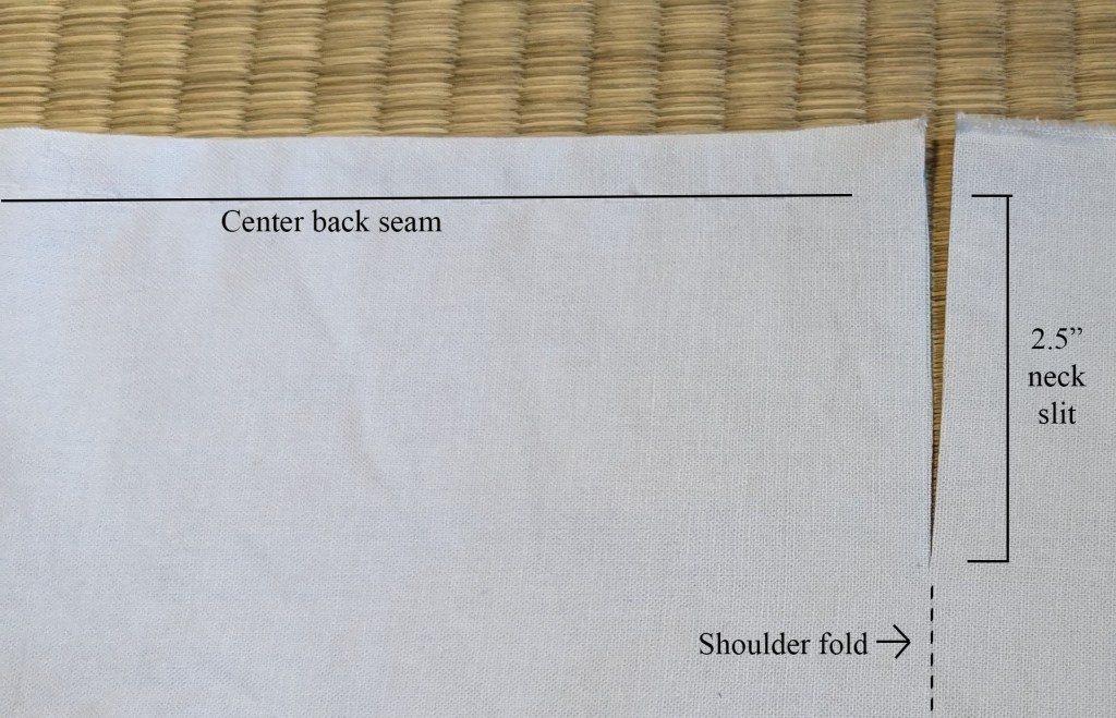 The neck slit is cut as a straight line exactly on the shoulder peak, 2.5″ in from your stitch line (not from the edge of the fabric) for a total slit width of 5″ when unfolded. If you have a particularly wide neck, you might need to make it a bit wider, but go slowly, since it’s easy to make it too big. The stitching of the center back seam stops 3/4″ short of the neck slit, allowing the collar to sit comfortably behind the shoulder peak.