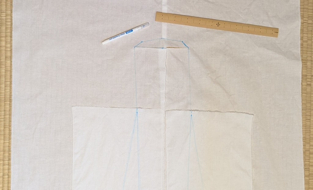 This tutorial uses a katabira pattern for demonstration purposes. If you are making a different garment such as a juban or hitoe, you would follow the same basic procedure using the appropriate pattern. Marking would normally be done using a creaser called a hera (箆, ‘spatula’), but a blue fabric marker is used here for better visibility.