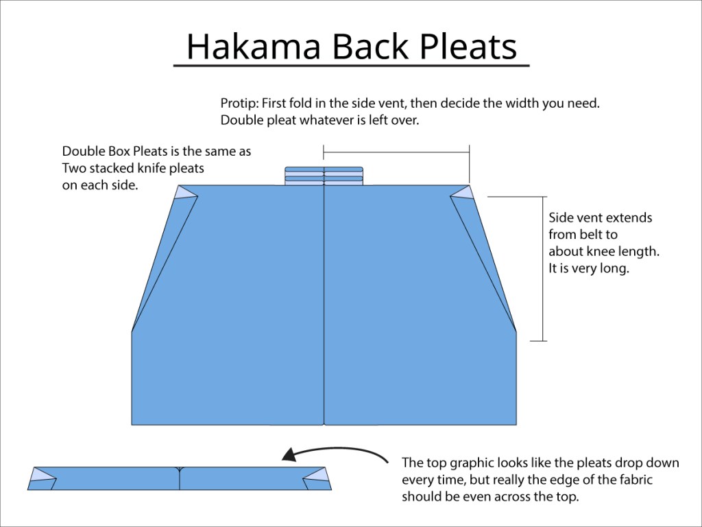 These pleats make the front and back top of the hakama fairly narrow. The tops of the hakama should not meet at the sides and should leave space for a side opening. There is not one set width of the tops of the hakama, but they probably should not be much wider than one “tan” panel width. Your individual pleat size may be deeper or shallower than someone else depending on your tan size and your desired final width. You may need to play with folding and pinning your fabric in different arrangements to get a final width that you are happy with.