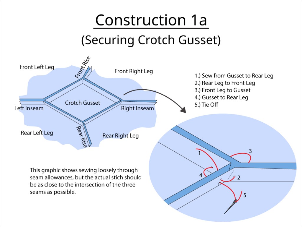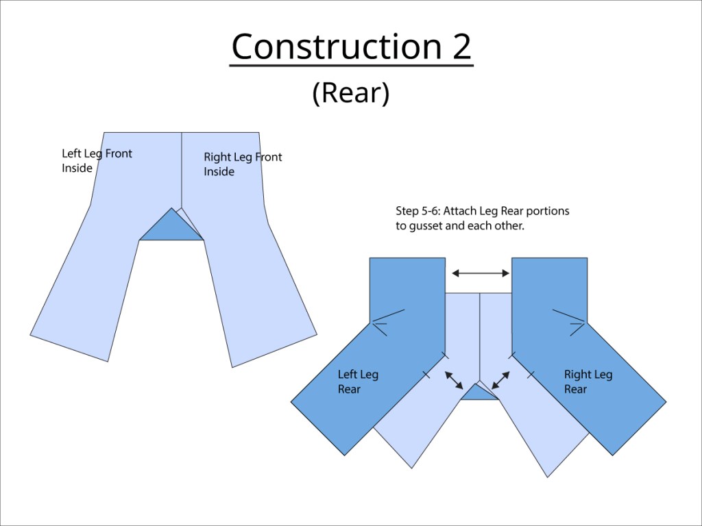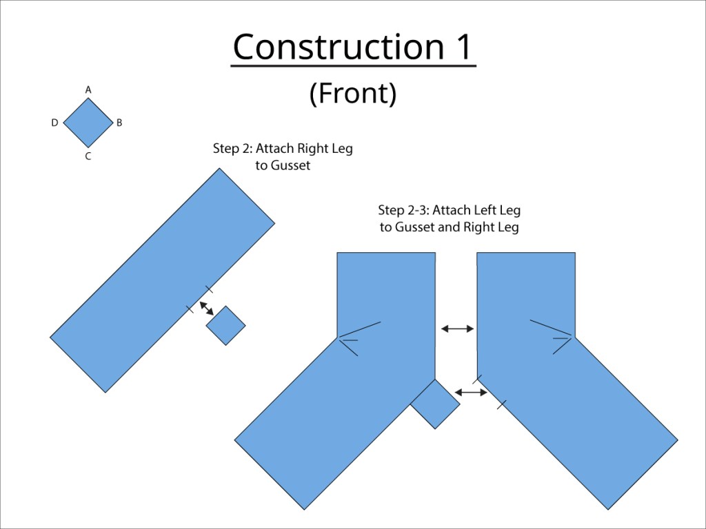 - Gusset Join – The length of the top to bottom of the crotch gusset measurement on the leg panels is equal to one of the sides of the crotch gusset itself.