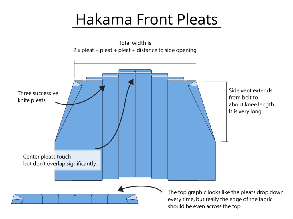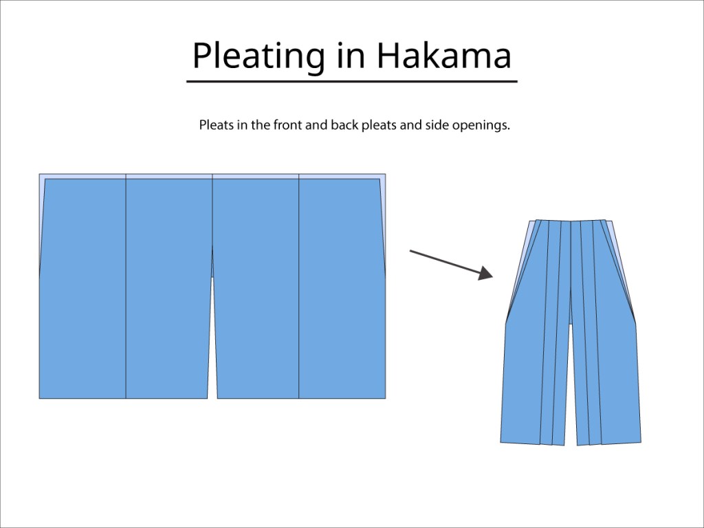 Along with the pleats, the top corners of the front and back of the hakama are folded inward to create triangular openings in the sides of the hakama which allow them to be comparatively one size fits all at the waist.