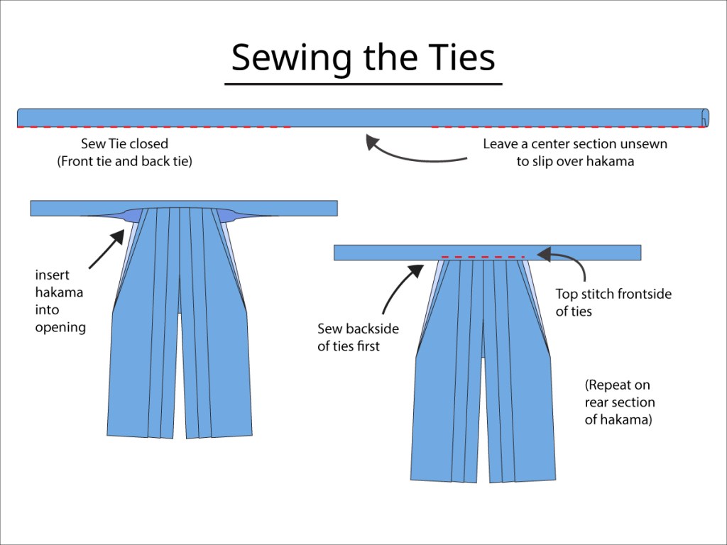 - Fold the ties back over the top of the hakama and top stitch the front section of the ties to the hakama.