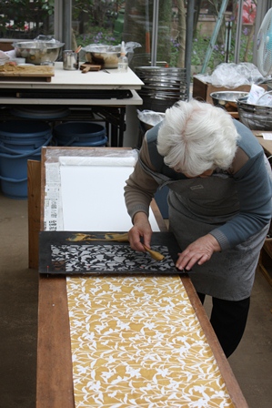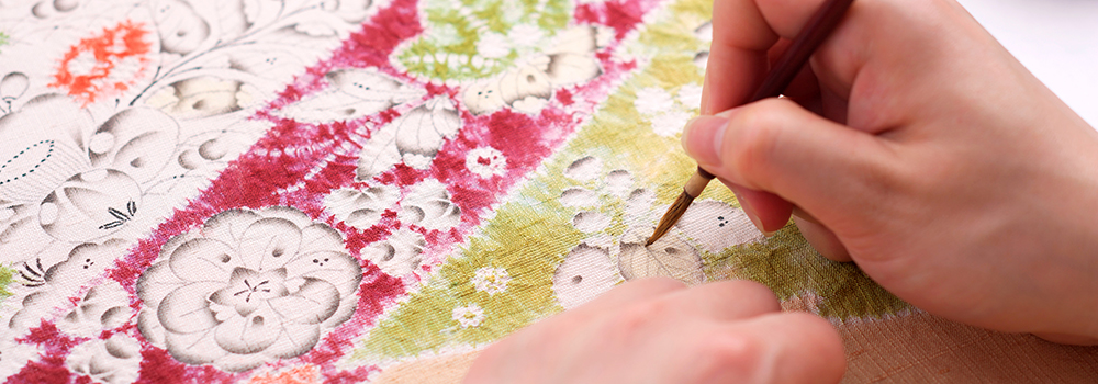 Applying ink/dye/pigment to fabric: kaki-e (描き絵, ‘drawing pictures’) and kata-surizome (型摺り染め, ‘stencil print-dyeing’)
