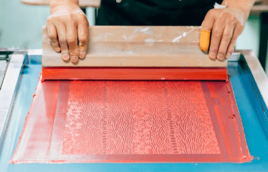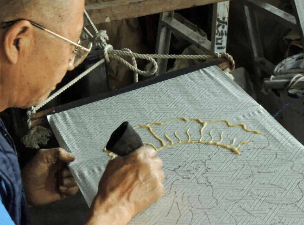 A mixture of rice paste is applied to the fabric before dyeing, so that the dye is prevented from reaching the fabric in those areas.