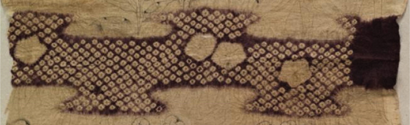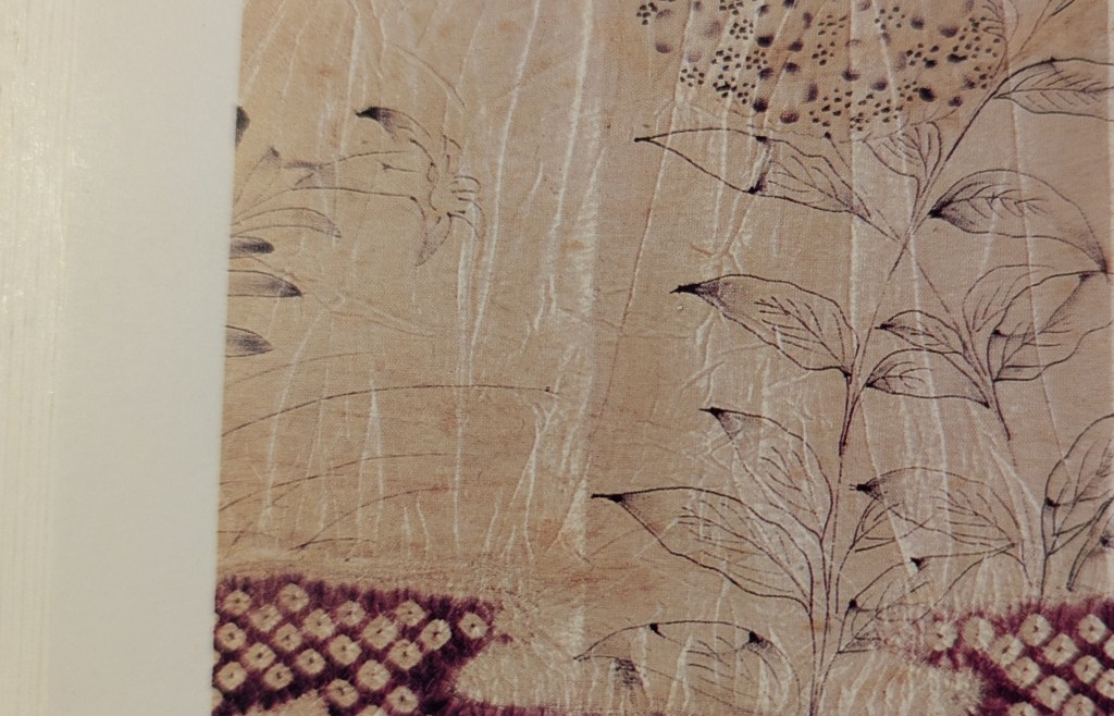 To begin with, we are calling this particular piece a “scrap”. In this case, scrap (JPN: “kire”/裂) is a technical term referring to the fact that this rectangle of fabric is only a piece cut away from a larger piece of fabric, which was itself probably part of an entire sewn garment. In Ito’s Tsuhjigahana, one page shows our piece of fabric and then the next page shows another piece of the same fabric, which is held in a different collection than the one we are examining. Clearly there is more of this fabric still extant than just this single scrap. This isn’t entirely unexpected. We do know that used clothes and cloth would often be donated to Buddhist temples where it might be cut up and repurposed for any number of uses, including altar cloths or curtains.