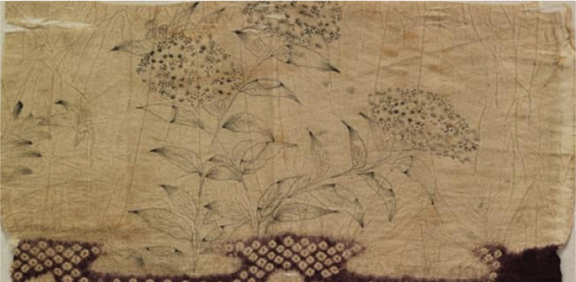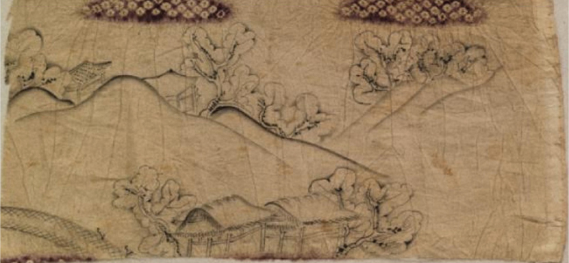 Between the rivers of purple, this fabric is decorated with a variety of scenes. We are going to look at the two which appear on our scrap here, but (as mentioned above) another scrap of the same fabric is contained in Ito’s Tsujigahana. Our scrap shows a scene of several flowers in a field and another of some mountainside huts. The other scrap, currently held by the Kyoto City University of Arts, has several cranes flying over some farm fields, and a depiction of some abandoned ox drawn carts. We can imagine that whatever original garment these scraps belonged to, the whole thing was a canvas for many different scenes. These ink drawings elevate the visual interest of this piece so far beyond just a set of repeated patterns. The wearer of this garment must have appeared as a walking working of art.