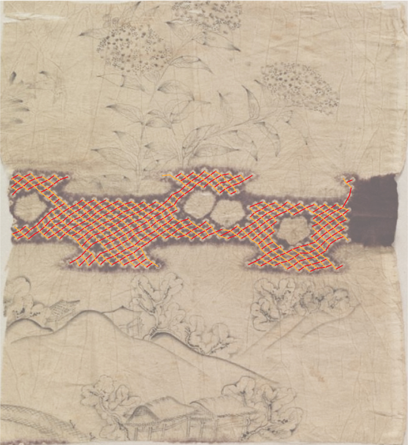 Even if some of the design elements on this scrap appear fairly randomly placed, a piece like this requires some fairly rigorous layout ahead of time in order to create a beautiful and cohesive final product. For a garment like the one that our scrap comes from, fabric might be cut up and loosely baste stitched together. Sizing, a substance used to stiffen the fabric, might also be applied to make the fabric easier to mark. Designs would be drawn onto the fabric with a brush and aobana (青花) ink. Aobana ink is a fugitive ink, meaning that it can be easily washed out from the fabric, made from flower petals. Artisans might either freehand some designs, or use a stencil to quickly mark out patterns. In this case, we would expect that the bar borders and the flowers would be marked ahead of time, while the squares are done freehand, and the ink drawings come in a later process. After the designs have been laid out, the garment is taken apart so that the individual pieces can be decorated.