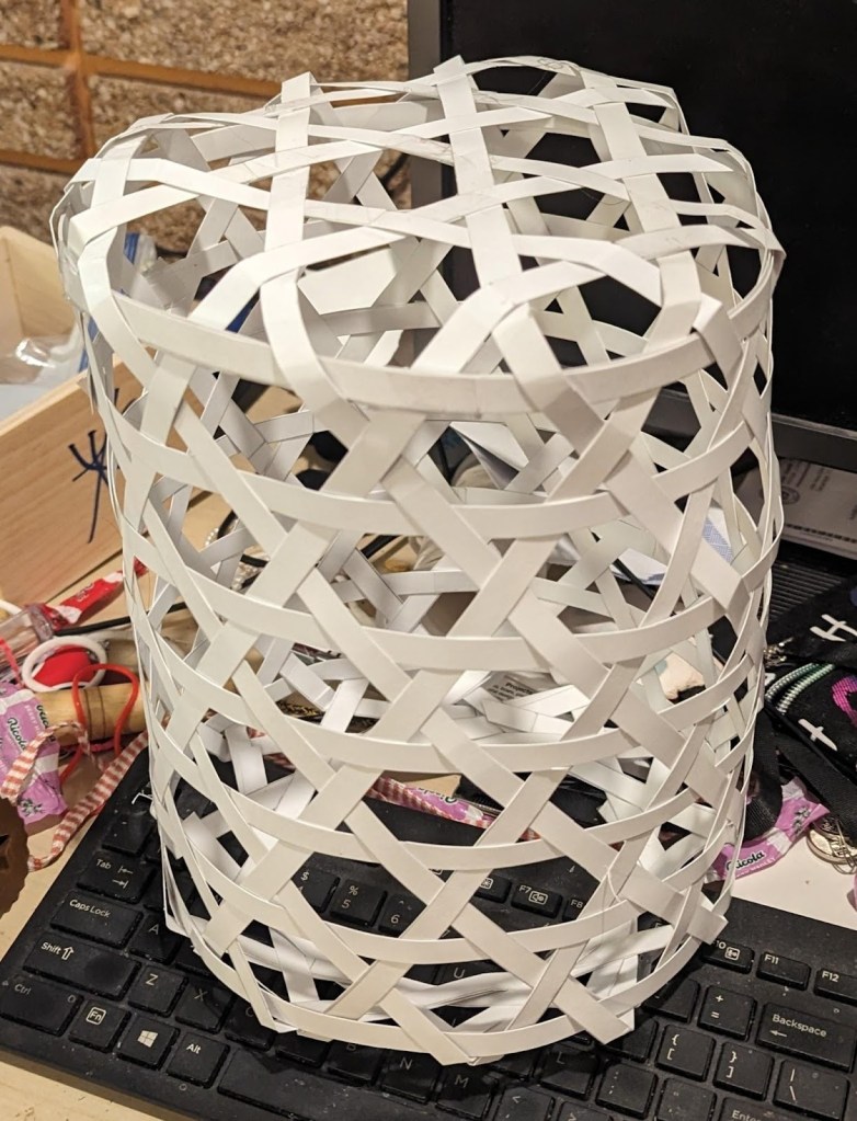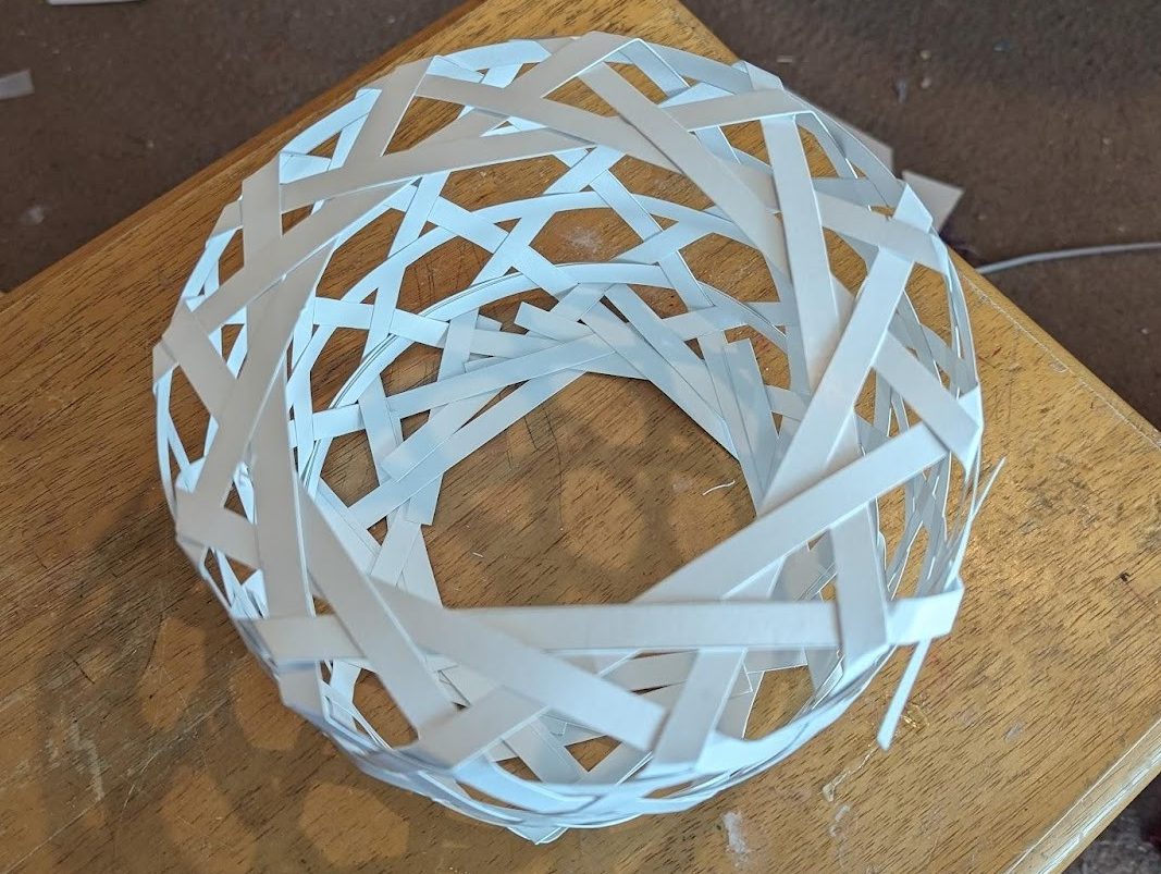Before making the full lantern, several tests were necessary to look at the possible size a lantern might be and see how it was likely to be woven. One of the more common basket weaving patterns used in Japan is the “kagome” style of basket. In this style, strips of material (usually bamboo) are interwoven in a system of triangles and hexagons. More details about this exact basket weaving style can be found both in the construction appendices, and through other online tutorials on places like YouTube. For this lantern, while the walls of the main body of the lantern look to be woven in a kagome pattern, the top and bottom of the body both have a large hole in the center and therefore can’t be woven using that basic method. Indeed, after making a few lanterns from strips of paper it became apparent that a sort of interlaced hoop would form the bottom of the basket, which would transition to the hexagonal star weave up the walls of the basket, and then change again to the hoop design on the top of the basket. With this idea in mind, it was time to start in on the actual item.