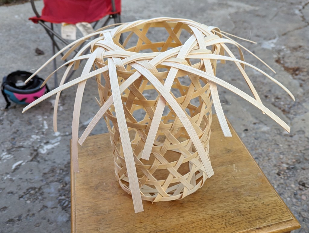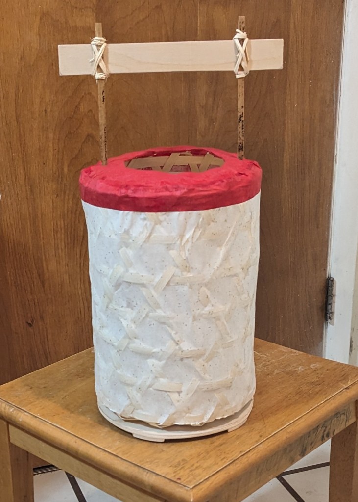 The basket of this lantern was woven by making that same interlaced hoop and then using a medium sized tin of Danish butter cookies (so-called “sewing cookies”) as a form around which to fold the reed ends and begin on making the walls, after the height of the basket passed that of the cookie tin, that form was removed and the basket was continued until it was a little more than a foot tall. From there, the reeds were bent at the top shoulder and moved back into position as another interlaced hoop. After the whole thing was dry, washi paper was glued to the outside of the frame (using basic white school glue) to make a protective covering for whatever flame might go inside and a way to diffuse light emanating from within. Historically, we would expect that the paper would be attached to the basket using a starch glue made from mashing up cooked rice, but white glue is much easier to come by these days. It can also be removed without too much difficulty if paper needs to be repaired or replaced.