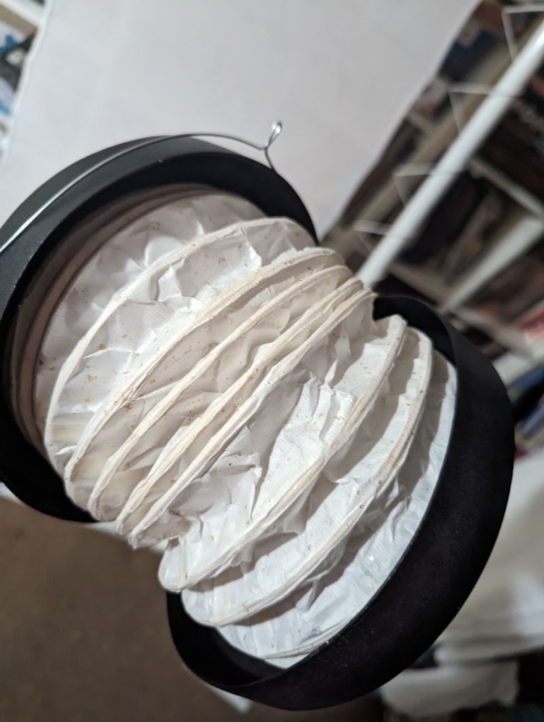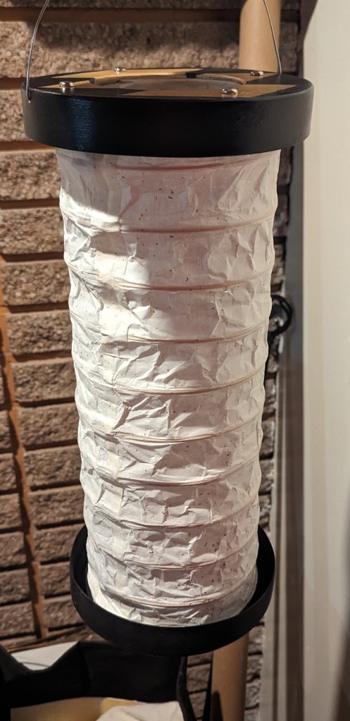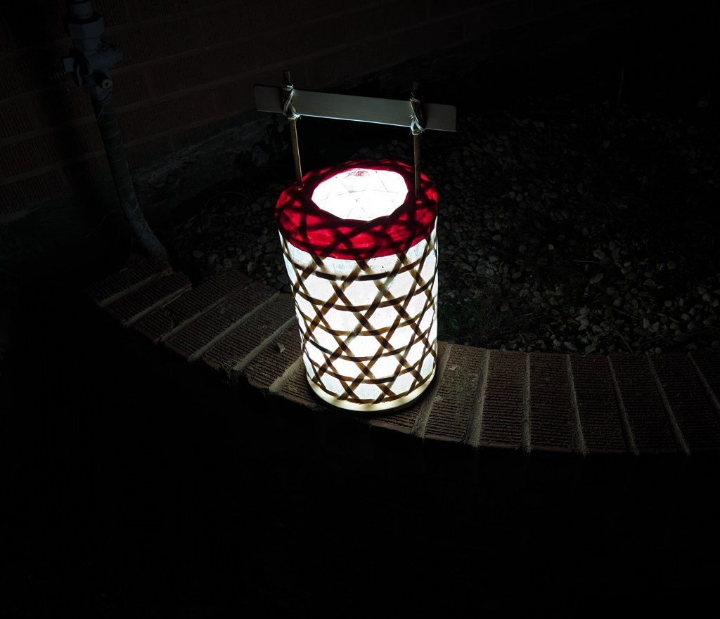 Both of these turned out very well, both in terms of form and function. The basket of the kago-chouchin slides readily up and down along the handles and the structure is sturdy but still light enough to carry. I don’t know how it would stand up to travelling in a fully packed vehicle to the SCA, but if it had been made from bamboo, I am confident it would be more than up to the task. As is, it may still fare well, but it’s harder to tell.
