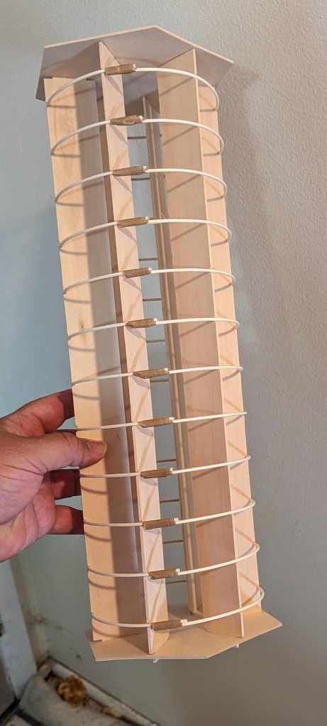 The ribs were each wrapped around the jig and secured with masking tape. Under normal circumstances, strips of washi paper and starch glue would be desirable to secure the ribs, but, again, this project is meant for accessibility. Once all the ribs were assembled, wide panels of paper were glued on and the jig was disassembled and removed from the inside.