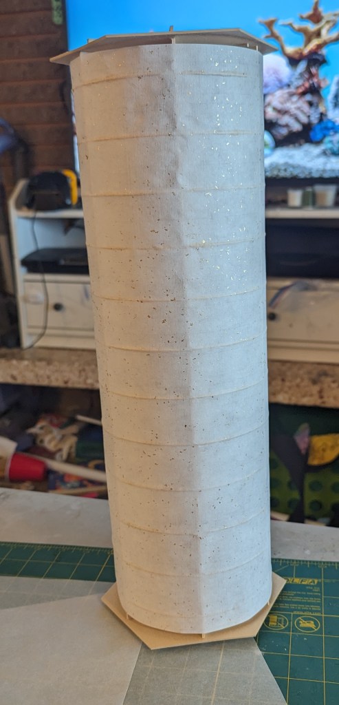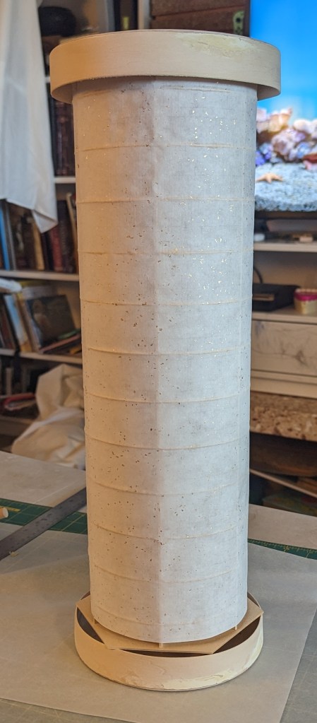 Meanwhile, the box ends had been assembled from thin pieces of balsa wood. The circular sections were cut on a Cricut and the sides are made from long strips of balsa wood which were soaked for several hours in hot water before being secured to circular forms to dry. The “steamed” strips were glued around the edges of the circles and the completed box ends were painted. Small slits were cut into the circular faces and metallic brads were fitted through to act as hooks for the paper body.