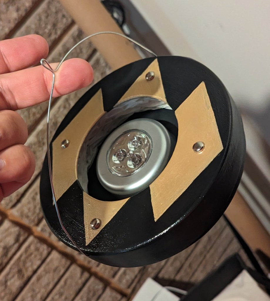 Finally, a semi-circle of wire was attached around the top of the lantern to make a handle, and an electronic puck light was secured to the bottom of the lantern. A simple press button light allows for ease of use in the middle of the night at SCA events.