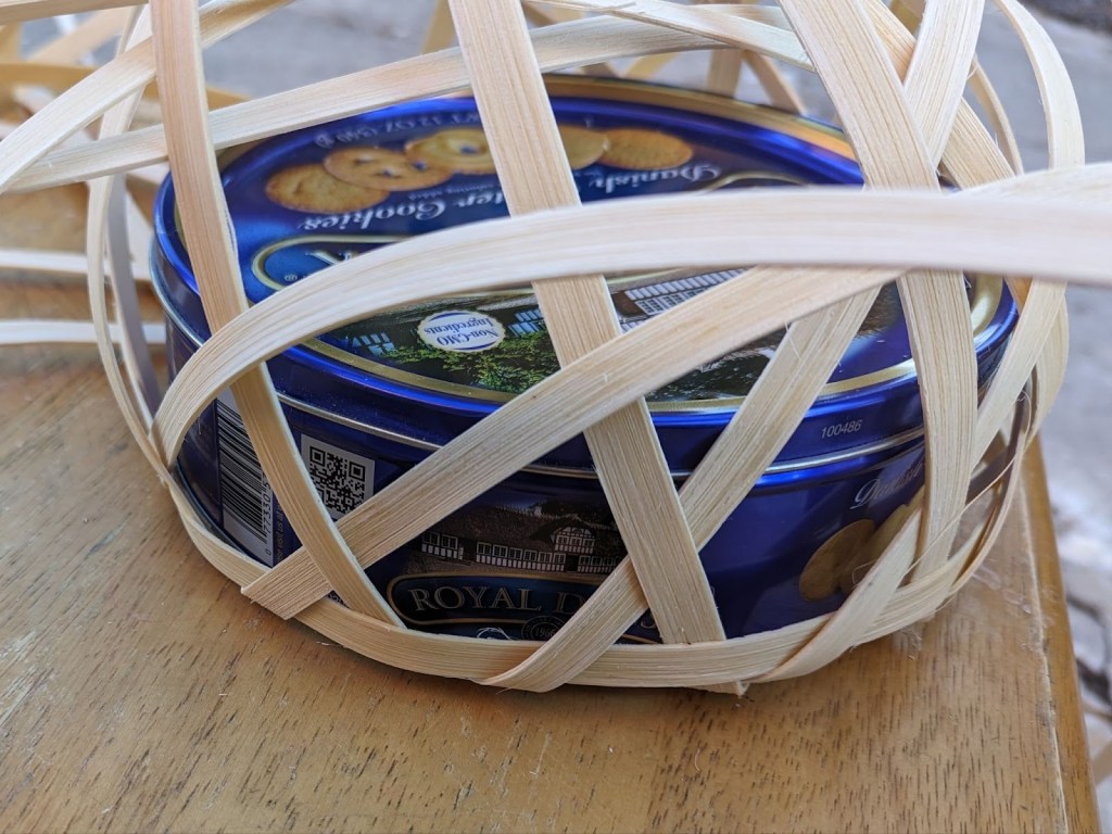 As you weave, the horizontal reeds will be longer than the circumference of the lantern. Weave the excess into the lantern. Be sure to begin your horizontal reeds at different places around the circumference so that there is no one area that is prone to sliding open.
