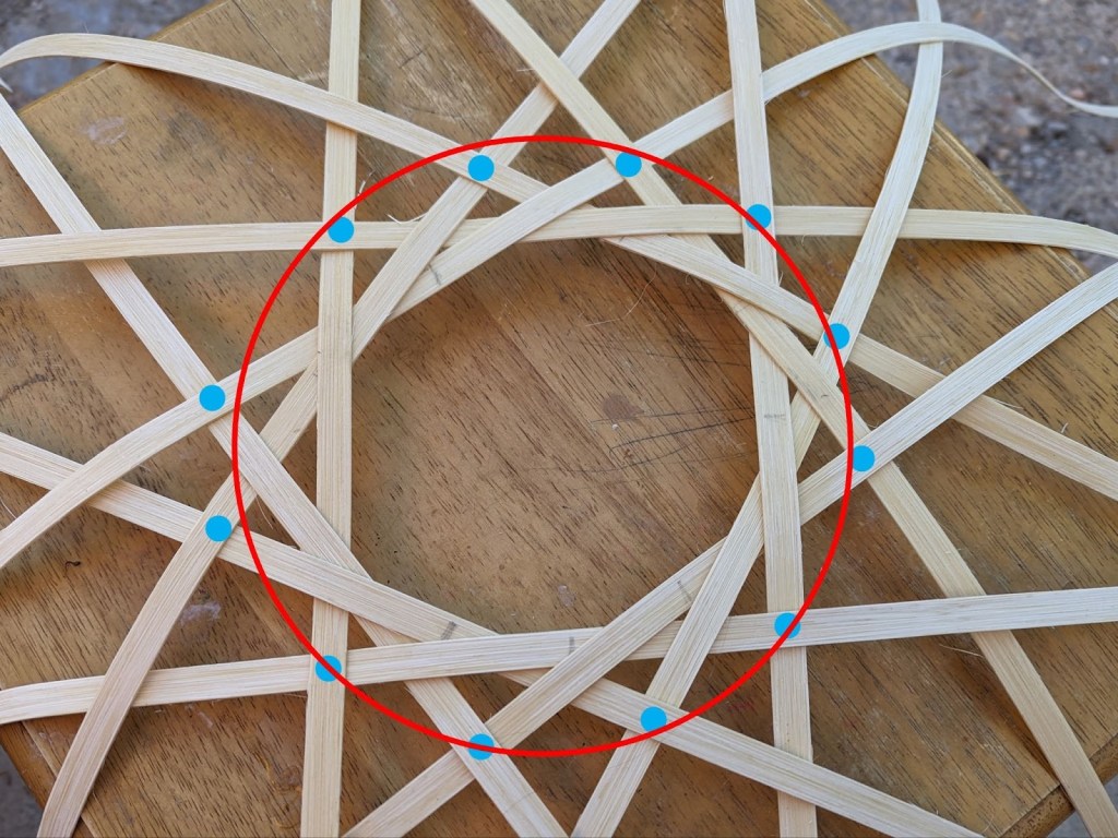 The reeds need to be folded up to begin the walls of the basket. The marked intersections form the ring where the reeds are to fold up.